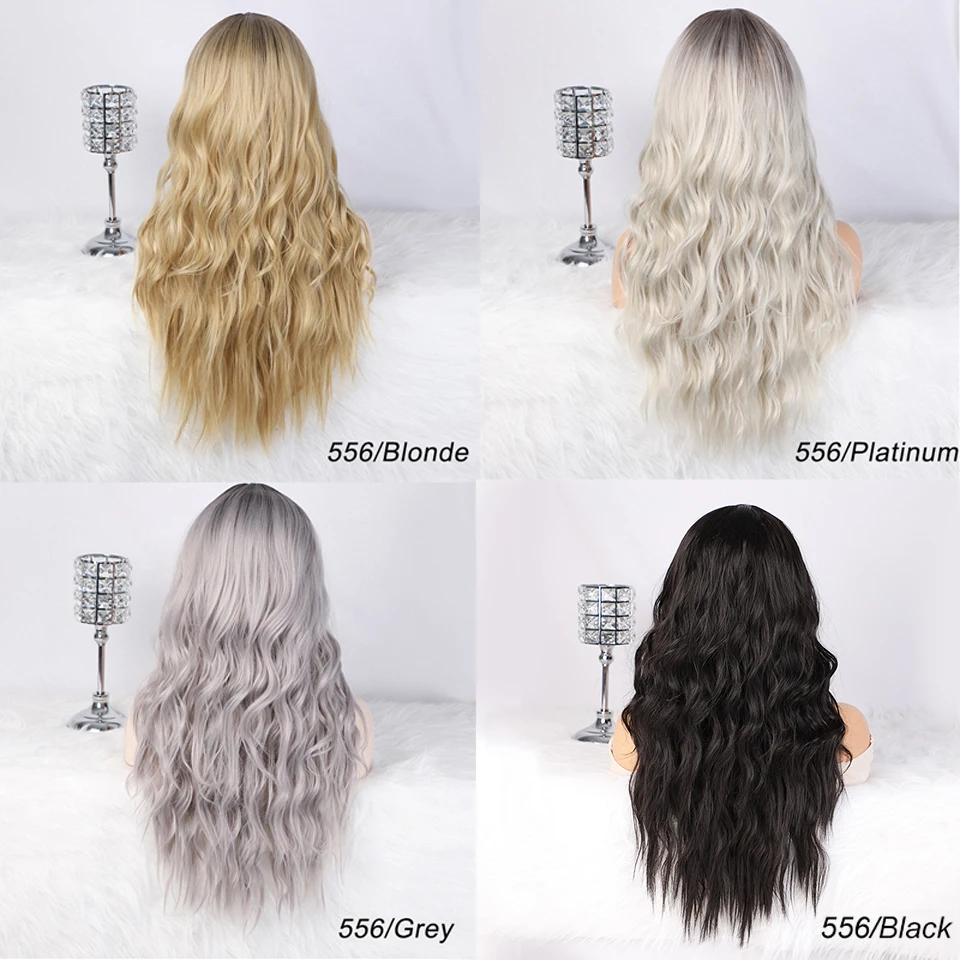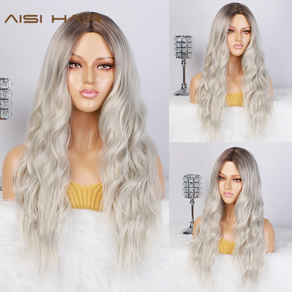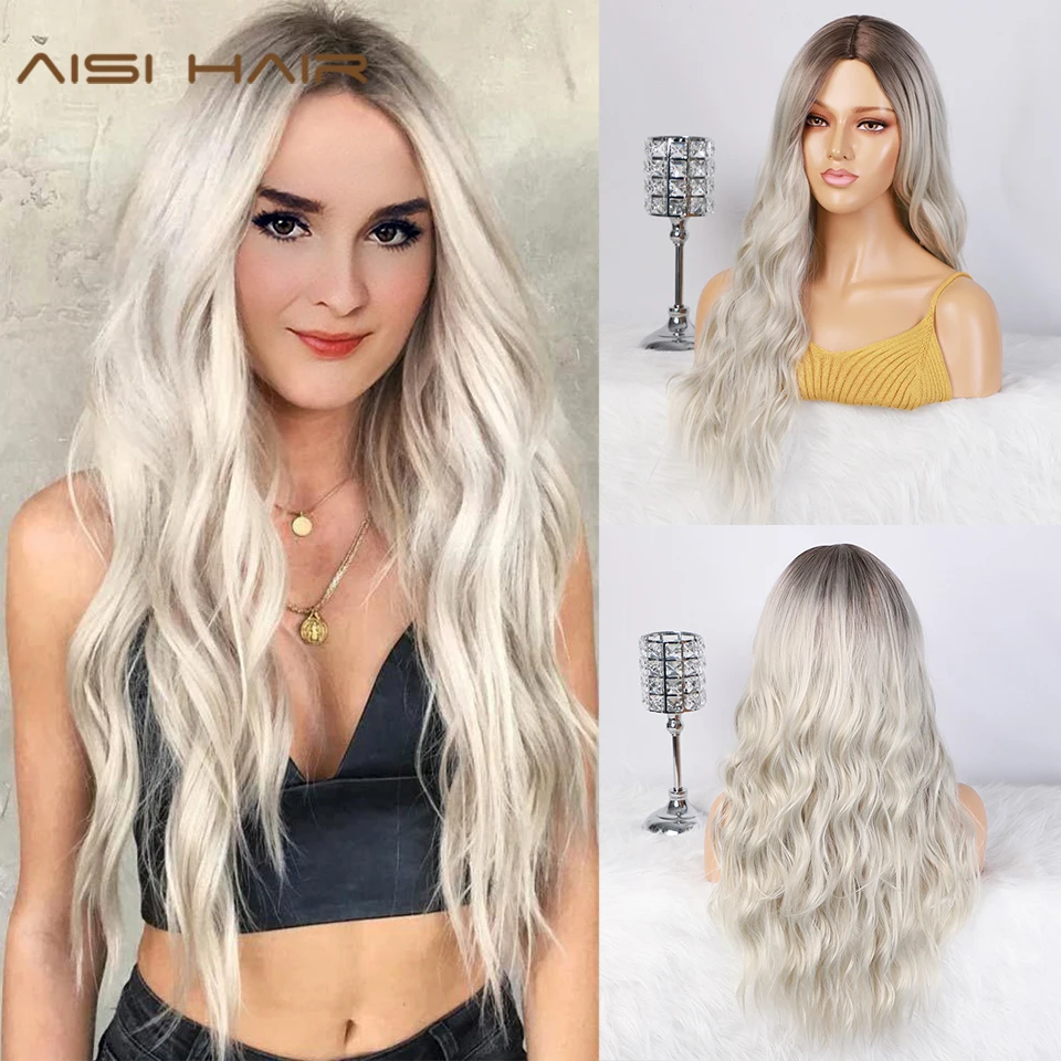 AISI HAIR Long Womens Wigs Ombre Platinum Blonde Wigs Heat Resistant Part Side Synthetic Wavy Wigs